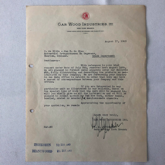 1945 - 1946 Gar Wood Industries Truck and Machinery Letter Letterhead Lot of 2