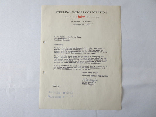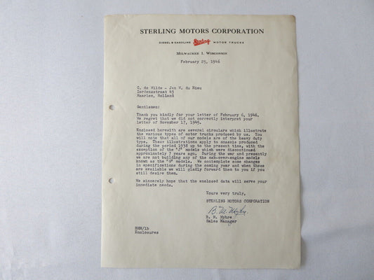 1945 Sterling Motor Truck Corporation Letter Letterhead Document