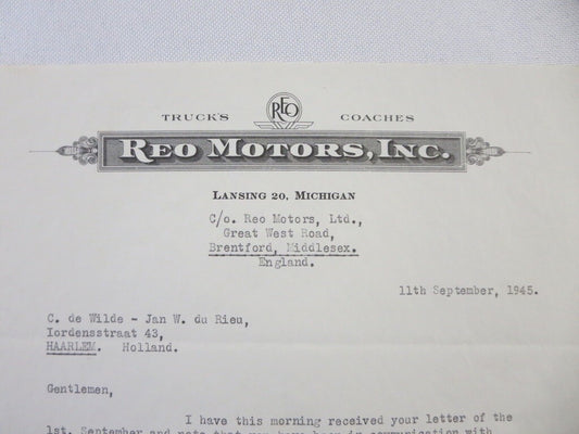1945 REO Motors Inc Correspondence Letter Letterhead REO Truck Bus