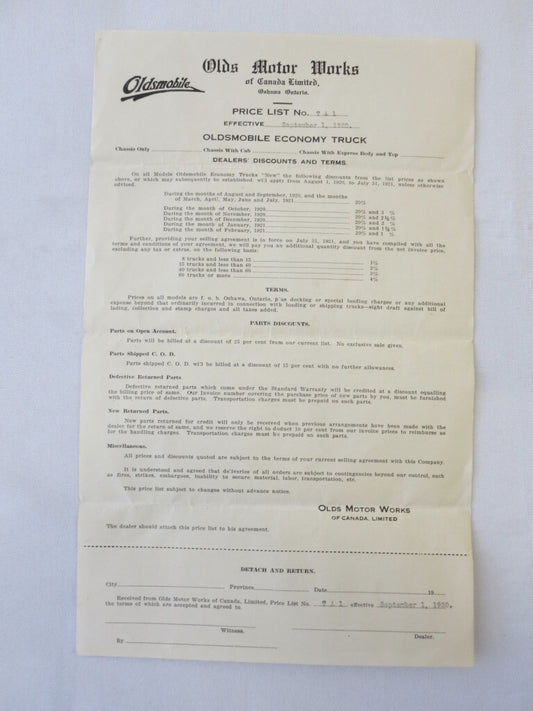 1920 Oldsmobile Economy Truck Factory Pricing Document Letterhead