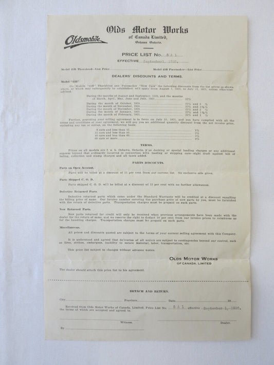 1920 Oldsmobile 45B Motor Car Factory Pricing Document Letterhead