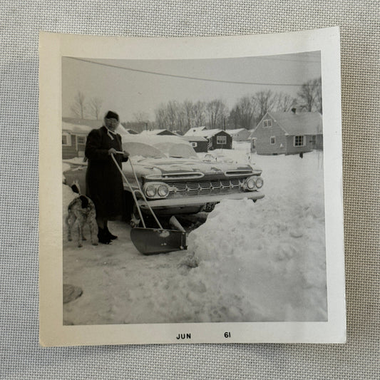 Woman Shovelling Snow with Car Snapshot Photo Photograph Lot 2x