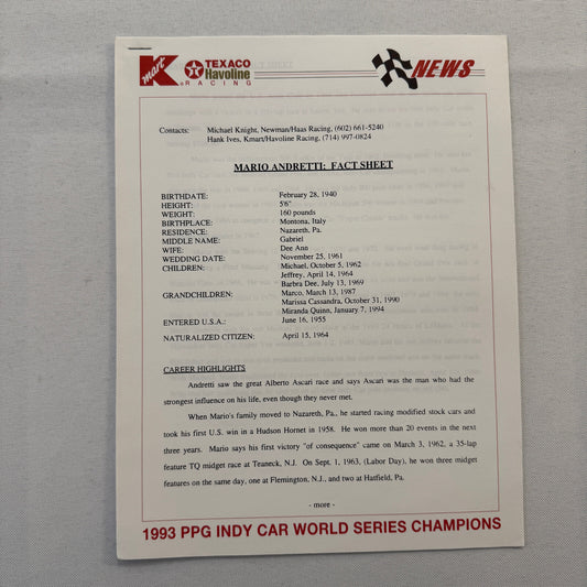 Mario Andretti 1993 PPG Indy Press Release Lot 2x KMart Texaco Havoline Racing