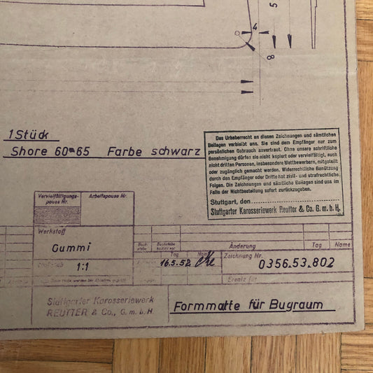 Vintage Porsche Reutter & Co Coachbuilder Factory Part Blueprint Document German