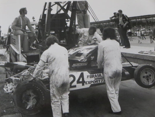 Vintage 1973 British Grand Prix Racing Photograph Photo - Carlos Pace Car Wreck