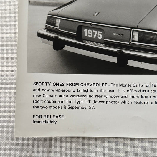 1975 Chevrolet Press Photo Photograph Monte Carlo Camaro Type LT Vintage